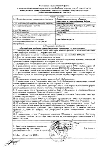 Сообщение о существенном факте о проведении заседания совета директоров эмитента и его повестке дня, а также об отдельных решениях, принятых советом директоров эмитента от 23.08.2011