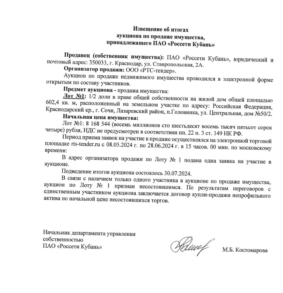 Извещение об итогах продажи имущества ПАО Кубаньэнерго посредством аукциона в электронной форме